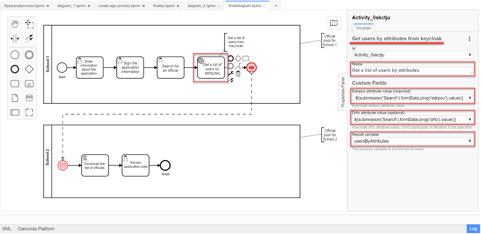 In the business process of the second school, the officer must perform the task (User Task) of transferring the student, that is, it is necessary to appoint a performer of the task in the new organization (school). To do this, you need first to get a list of potential users in the relevant organization (performers) from the Keycloak service, and then use this list to grant task access to users in the second business process.