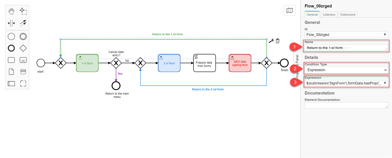 Example 3. Modelling cancellation of entered data and returning to the service menu using thesubmission()JUEL expression${submission('Firsttask').formData.hasProp('_action_code') && submission('SignForm').formData.prop('_action_code').value().equals('cancel')}- Explanation