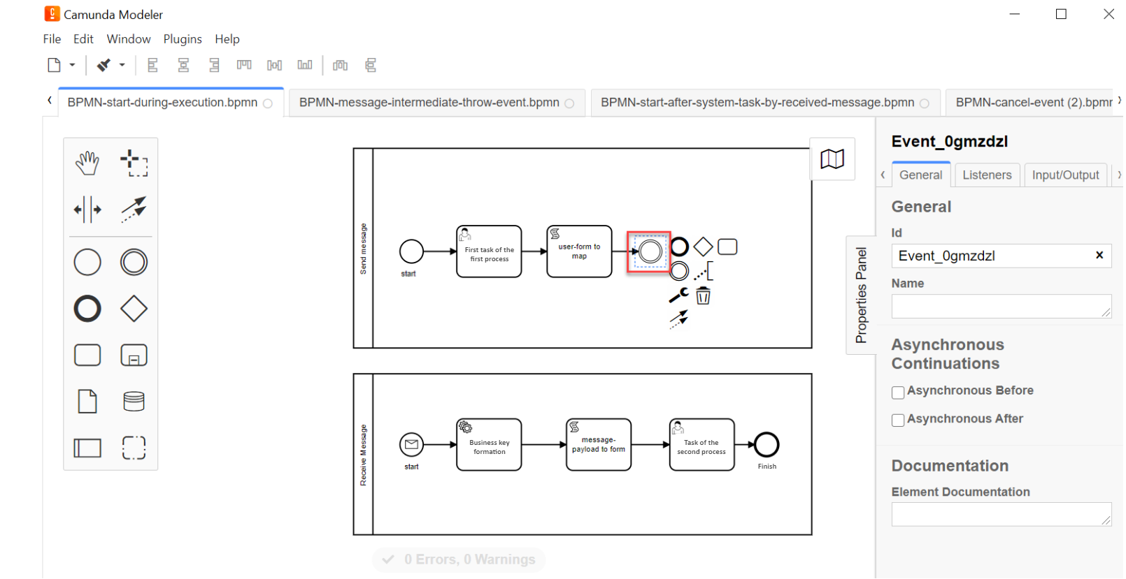 Prepare two modeled business processes within two pools that will interact with each other via messages (here we will use Send Message and Receive Message processes). |