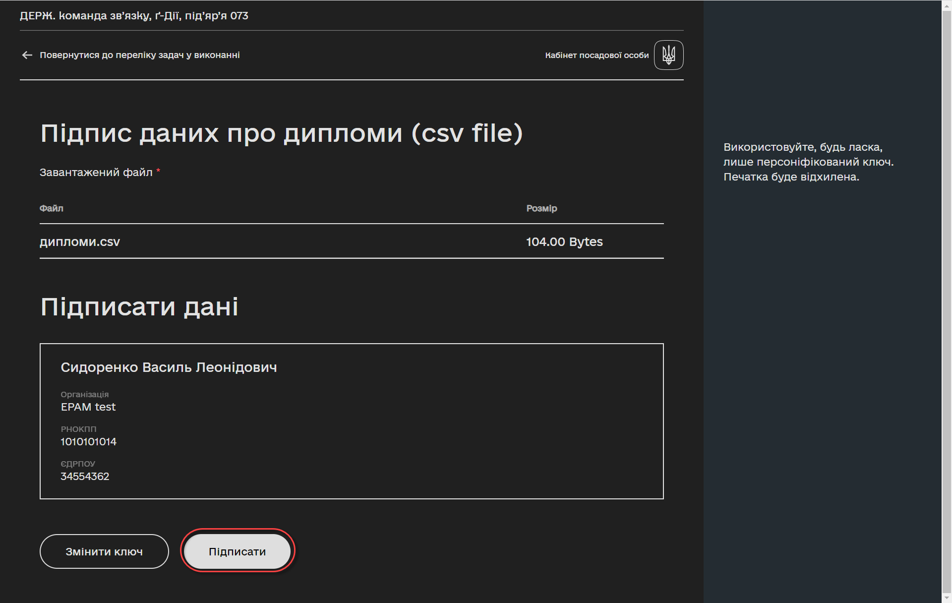 X-Access-Tokenfield, enter the user’s system access token under which the operation is performed, for example:${completer('signCsvFileActivity').accessToken}. -