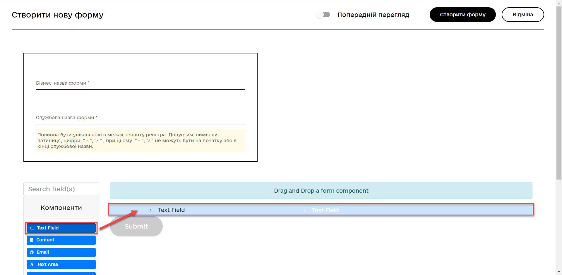 In the components panel on the left, select the Text Field component and drag it onto the modeling canvas.