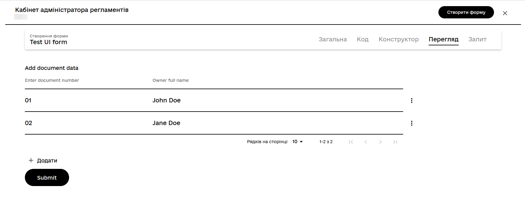 This is how you create a table with columns of different types (in our example, components Text Field and Date / Time) combined into a single array under the Edit Grid component. From now on, officer users can fill out the UI forms with real data as part of the business processes. After the data is digitally signed, it will be saved to corresponding tables in the database.