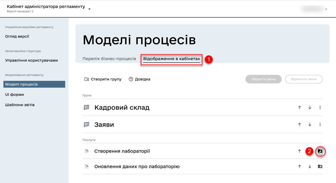 The registry regulations developer can group and sort business processes through the web interface of the administrative portal. Changes to grouping and sorting settings are validated during the publication of the registry regulations and deployed in the corresponding environment.