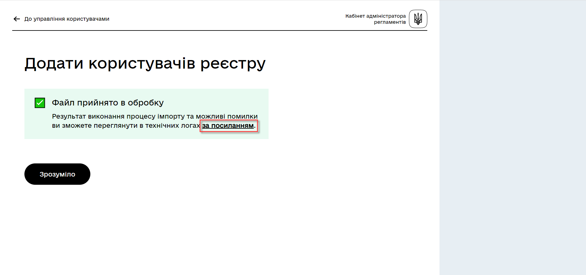 On the next step, there will be an indication that the file is being processed. Please wait a few minutes for the complete loading of registry users. The message will also include a link to the Kibana service, where you can view the processing results of the file: the number of processed records, the number of successful imports, and the number of errors.