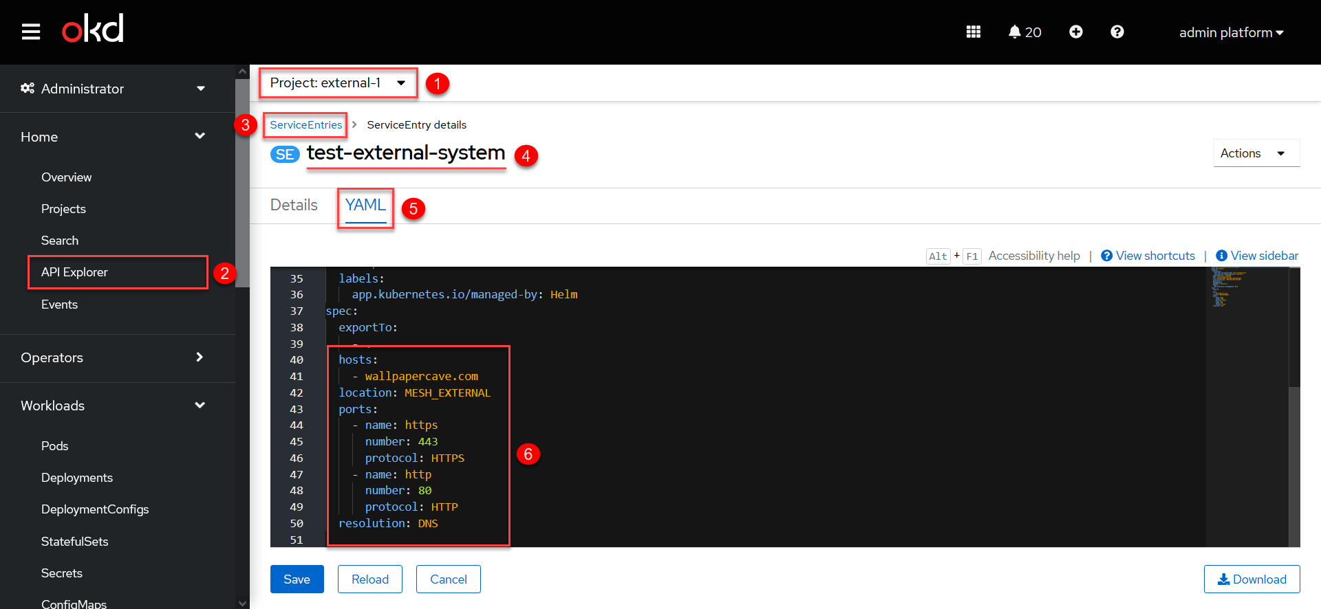 http://orhttps://, meaning that the external service will be accessible through port80or443, respectively.These settings are automatically added to the Service Entry YAML configuration (see the steps further in this topic).