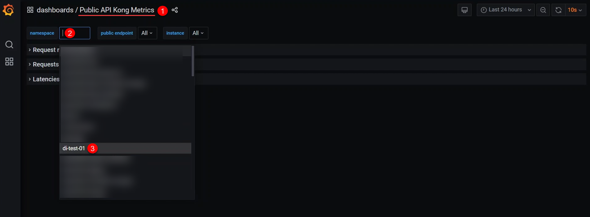 In the search bar, locate Public API Kong Metrics, click namespace, and then select your registry.