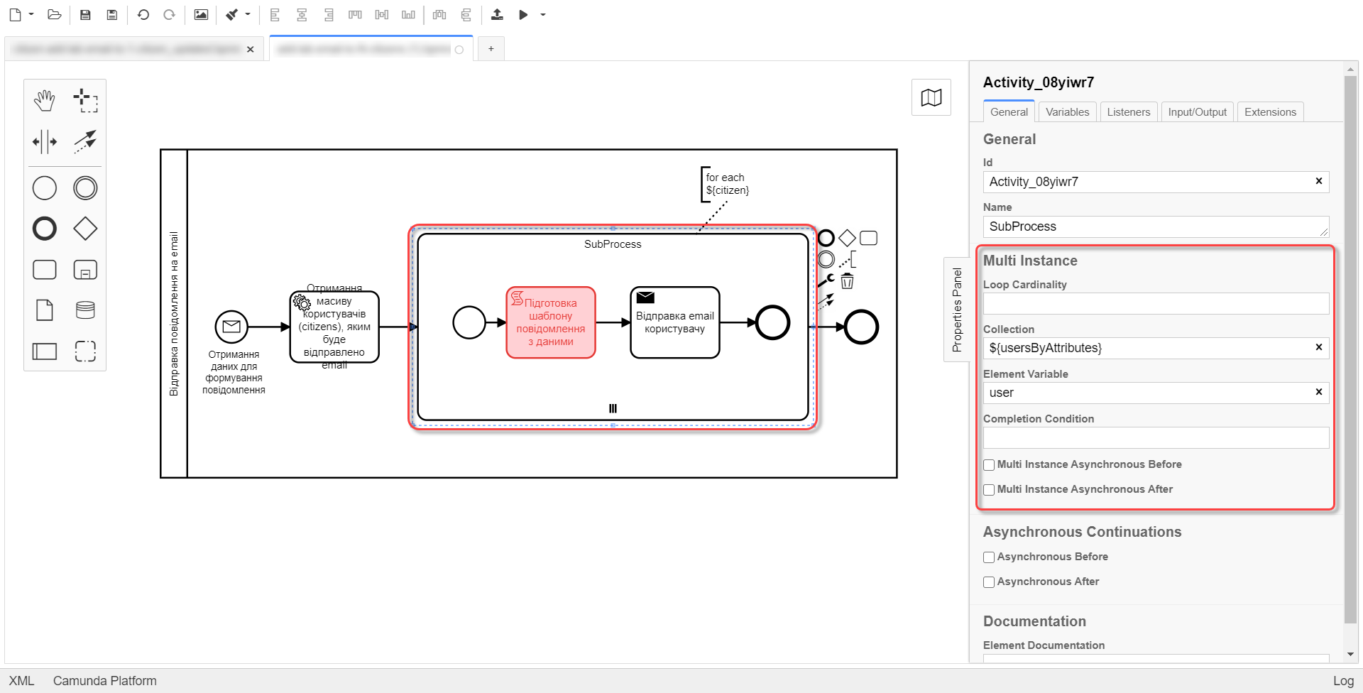 To notify multiple users, you need to model a business process similarly to notifying a single user, but this time using the Multi-Instance function. This function allows sending messages to all users in an array simultaneously.