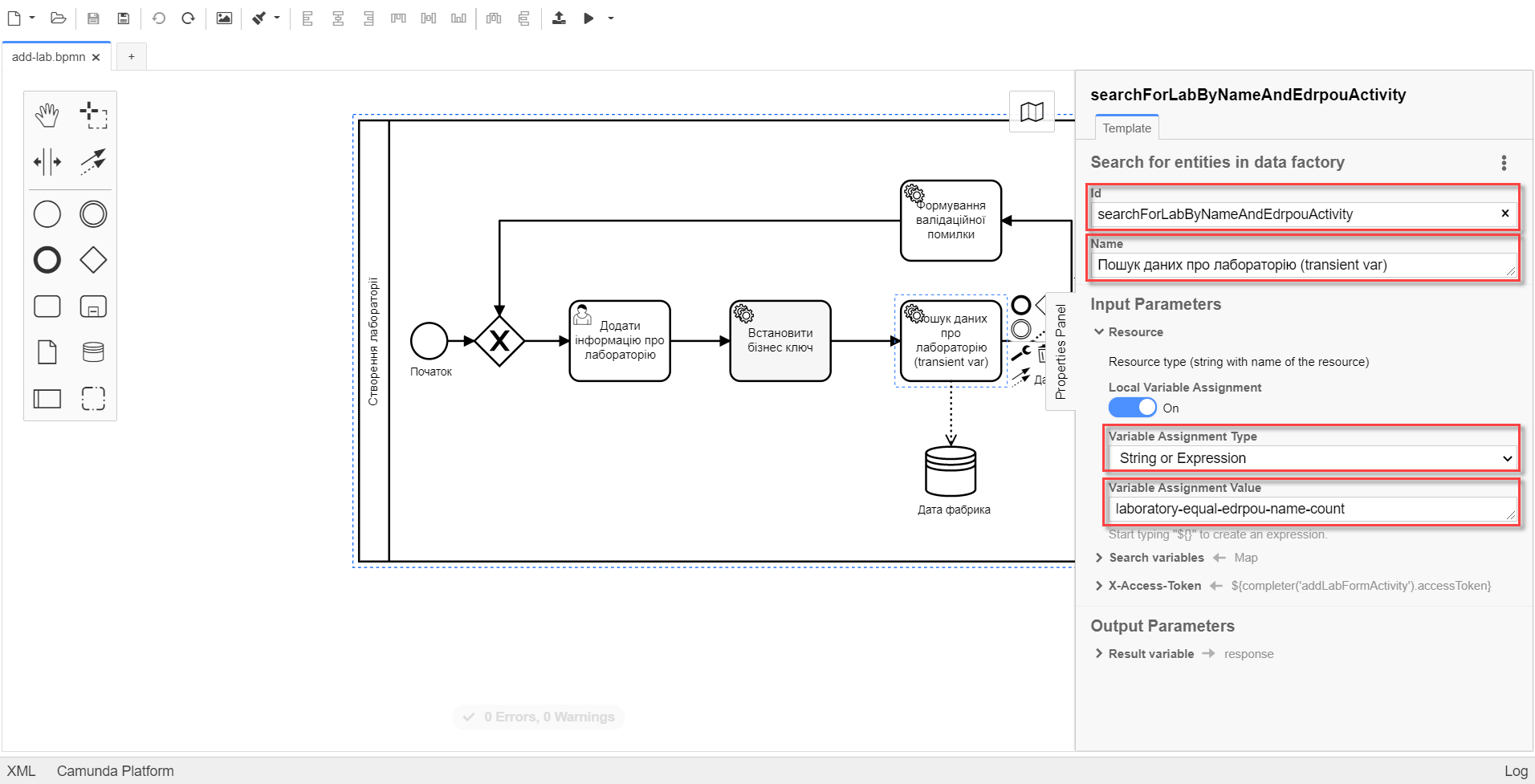 During the business process modeling phase, it is necessary to create and save the corresponding BPMN diagram. Please use the add-lab.bpmn file with the pre-designed business process schema as an example. |