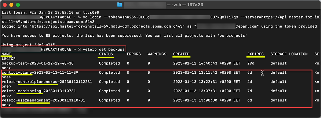 velero get backupsВ результаті отримуємо список бекапів центральних компонентів, а саме їх назви, статуси, дату та час створення, а також час, протягом якого ці бекапи зберігатимуться у сховищі.