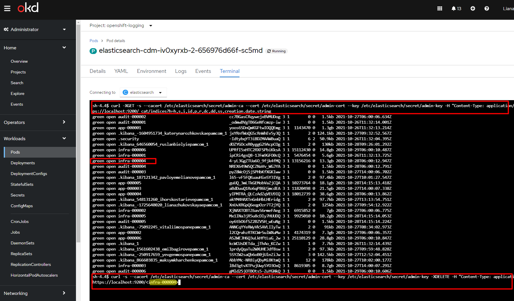 infra-000004. Для цього виконайте наступну команду:curl -s --cacert /etc/elasticsearch/secret/admin-ca --cert /etc/elasticsearch/secret/admin-cert --key /etc/elasticsearch/secret/admin-key -XDELETE -H "Content-Type: application/json" https://localhost:9200/infra-000004