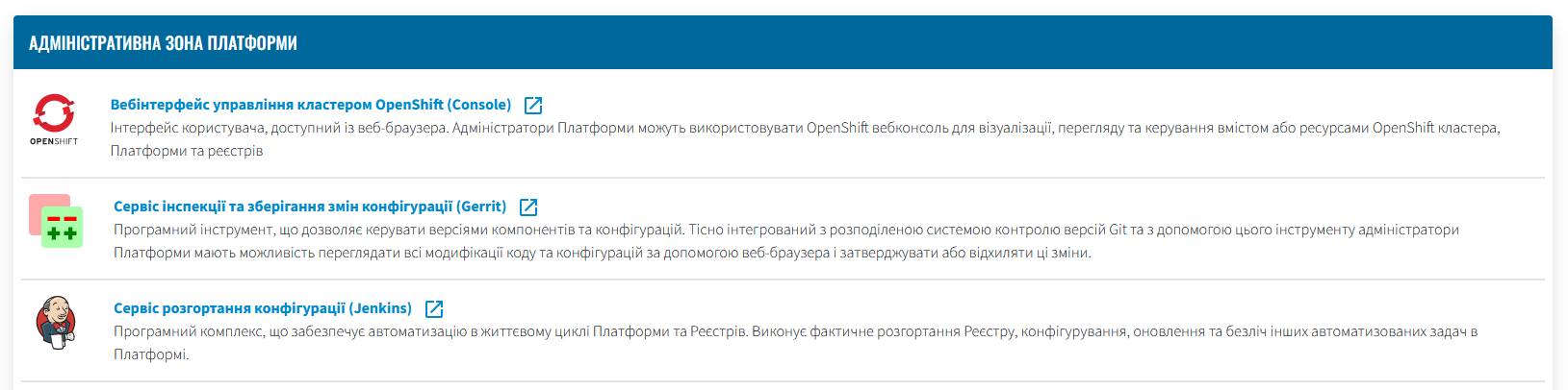 Програмний комплекс, що забезпечує автоматизацію в життєвому циклі Платформи та Реєстрів. Виконує фактичне розгортання Реєстру, конфігурування, оновлення та безліч інших автоматизованих задач на Платформі. |