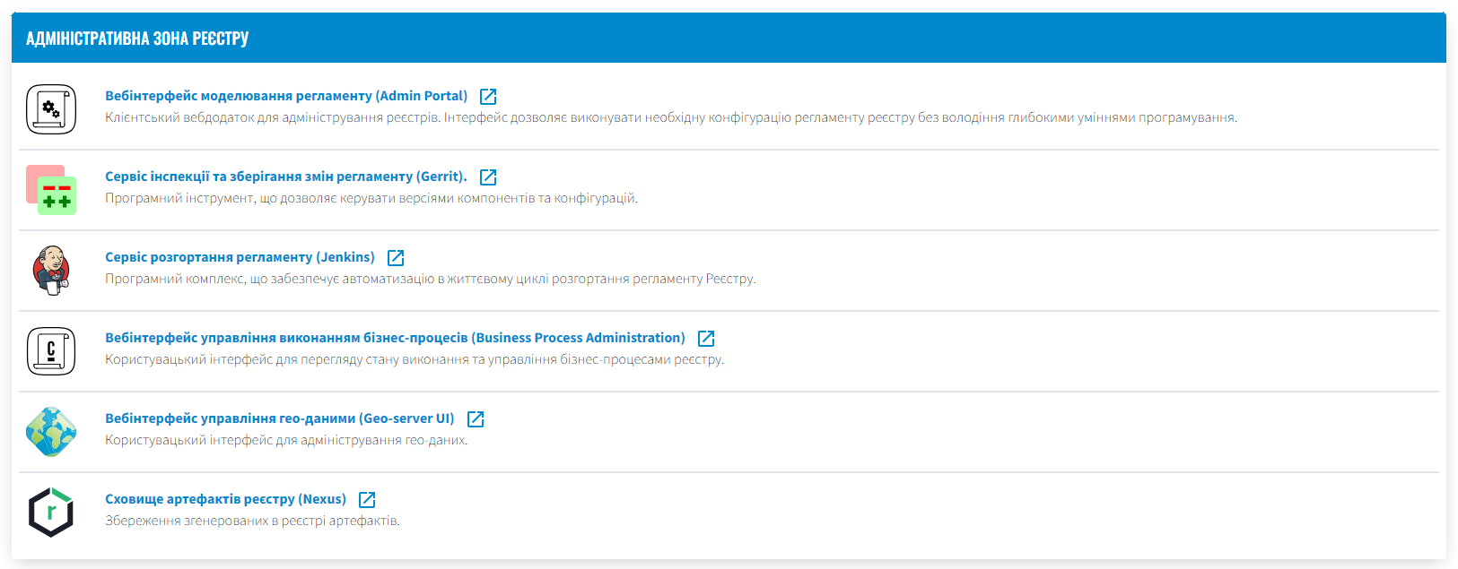 Якщо деякі компоненти не доступні в рамках поточного налаштованого профілю реєстру, їх посилання та призначення не відображаються. Наприклад, якщо Геосервер не розгорнуто, посилання на нього буде відсутнє (детальніше про геомодуль ви можете дізнатися на сторінці Робота з геоданими у реєстрі).