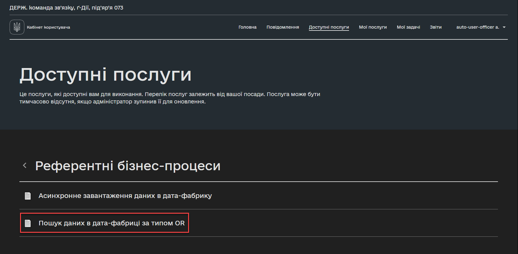 У Кабінеті користувача процес буде доступний у папці Референтні бізнес-процеси > Пошук даних в дата-фабриці за типом OR.