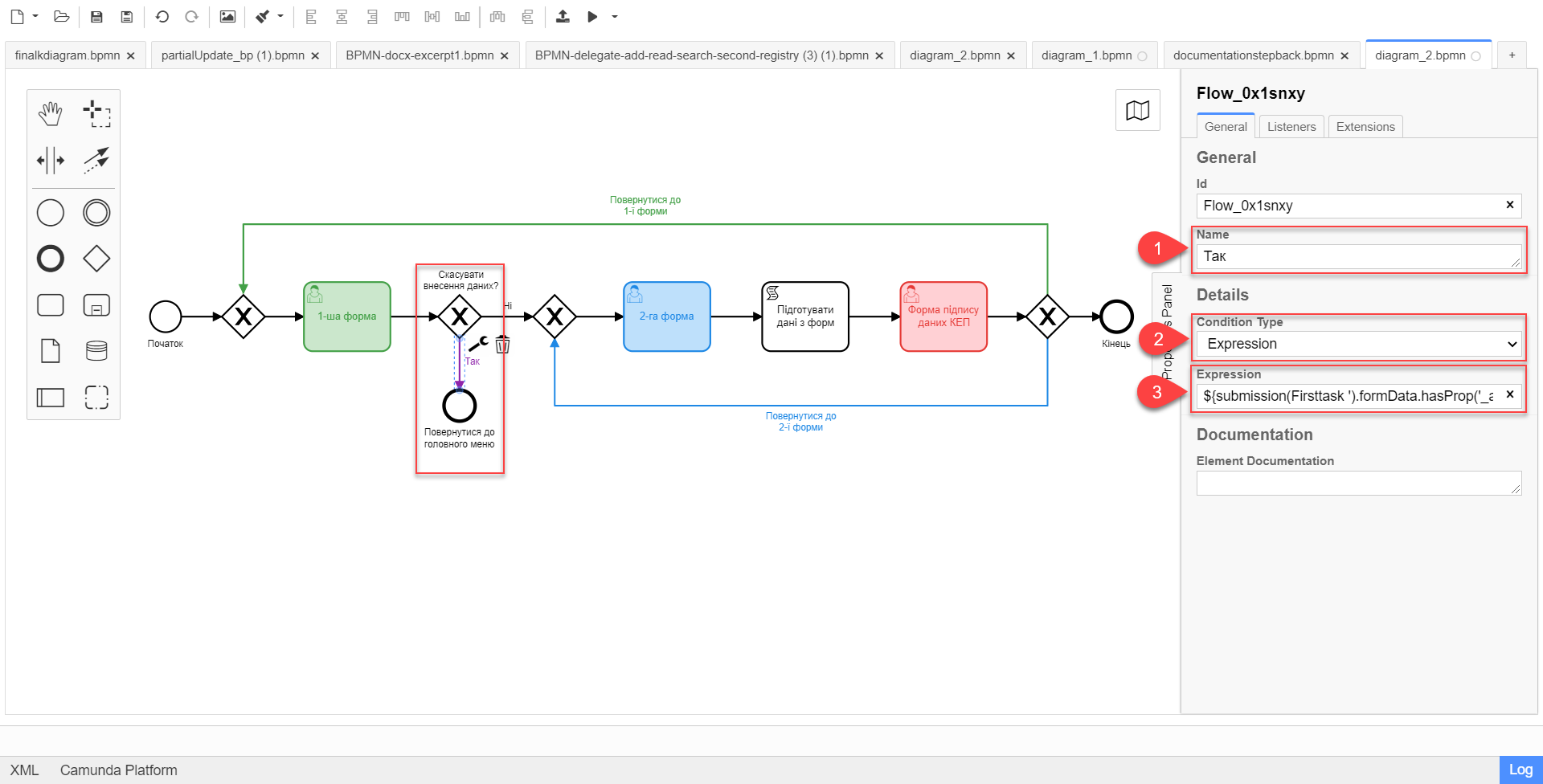 Приклад 2. Моделювання повернення до 2-ї форми за допомогою JUEL-функції submission()${submission('SignForm').formData.hasProp('_action_code') && submission('SignForm').formData.prop('_action_code').value().equals('return_to_second')}- Пояснення