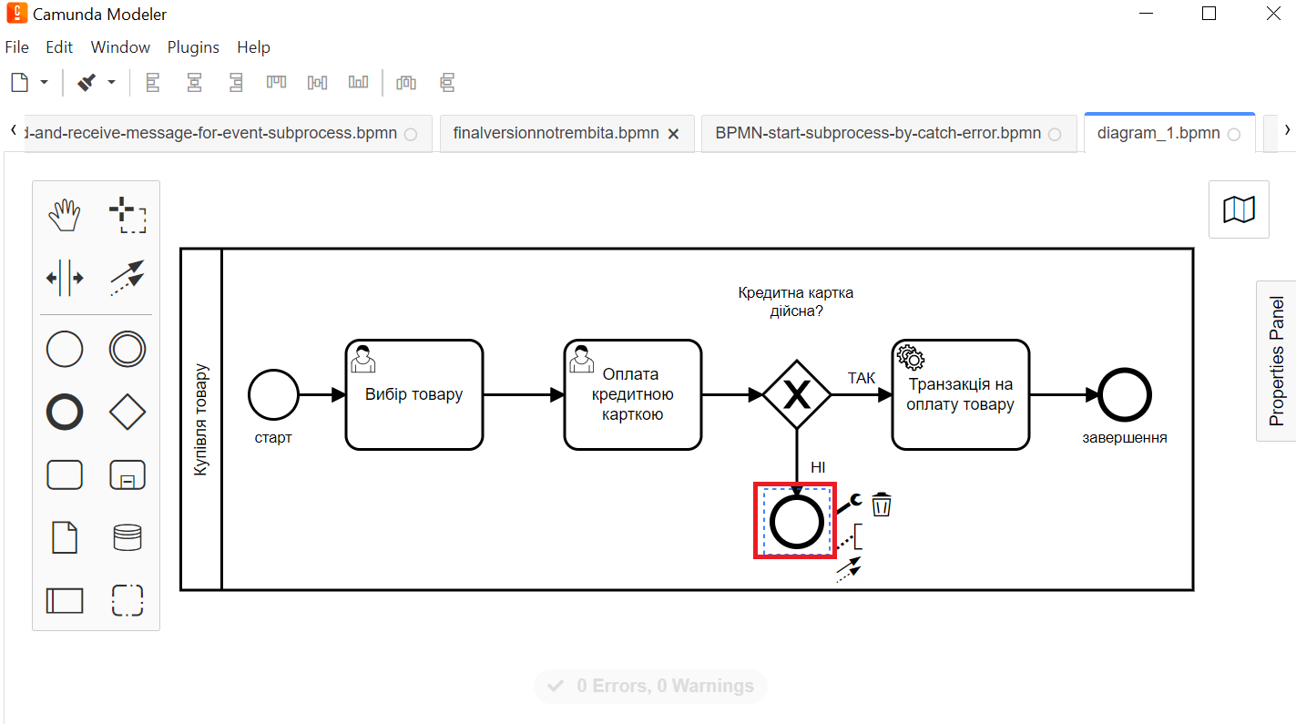 Для моделювання та налаштування кінцевої події «Помилка», виконайте наступні кроки: