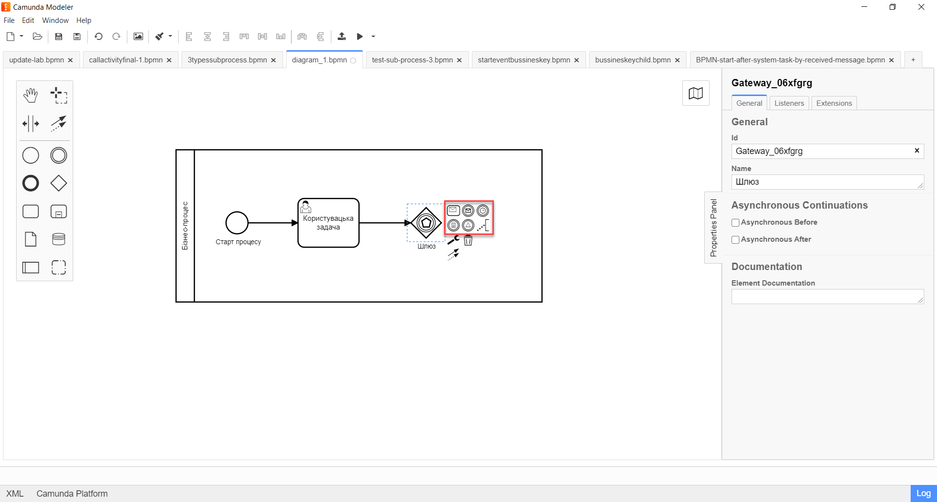 | Платформа реєстрів наразі підтримує 2 типи подій, з якими може взаємодіяти елемент Event-based Gateway: «Таймер» і «Повідомлення», а також задачу отримання (Receive Task). |
