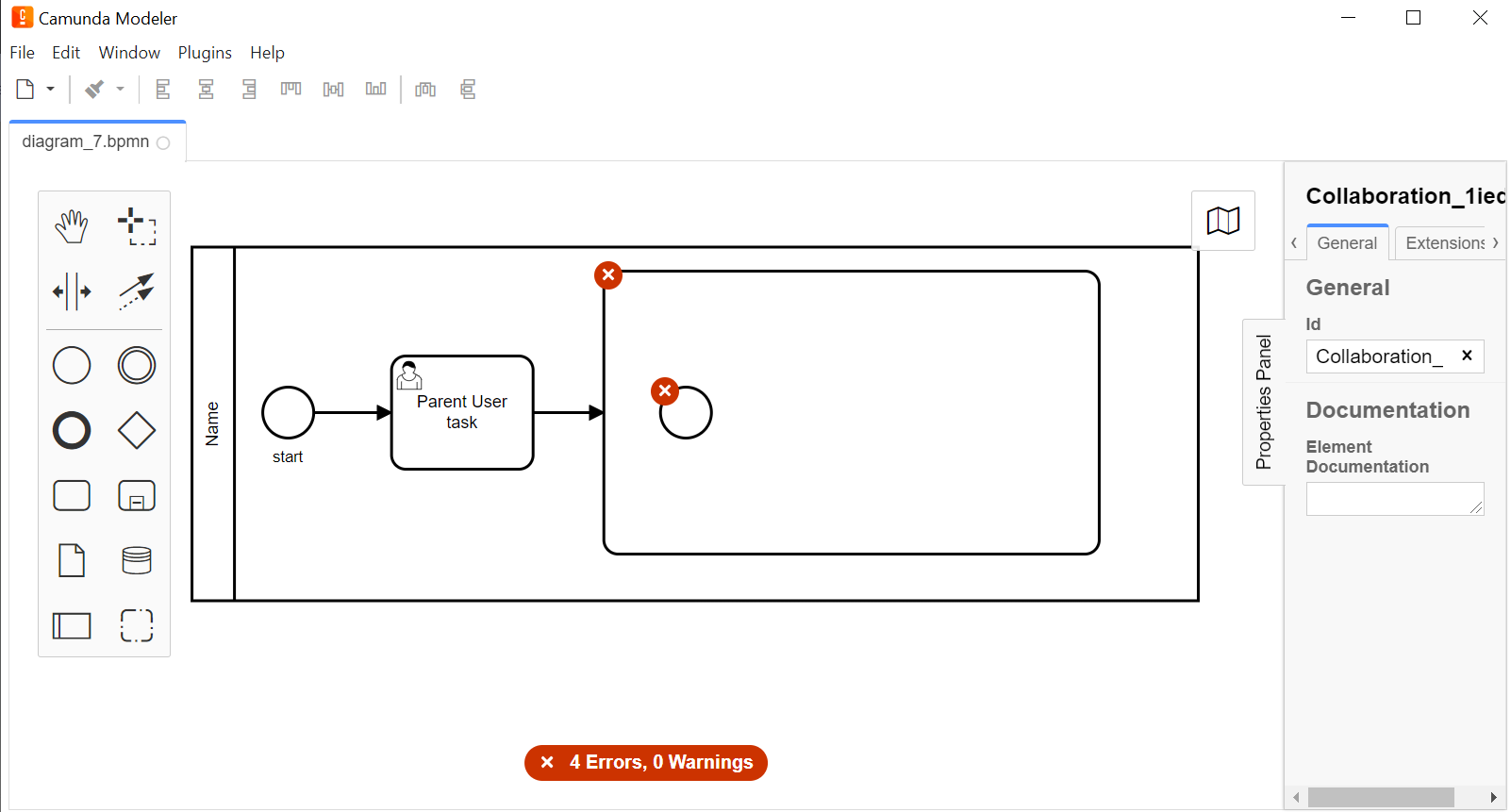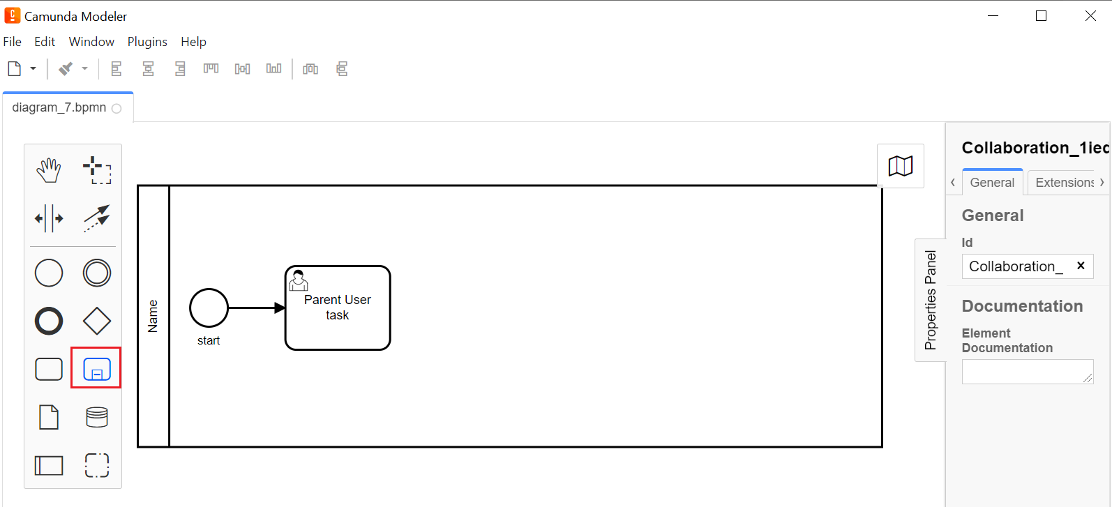 На панелі інструментів зліва оберіть елемент Create expanded SubProcess та перетягніть його до області моделювання.