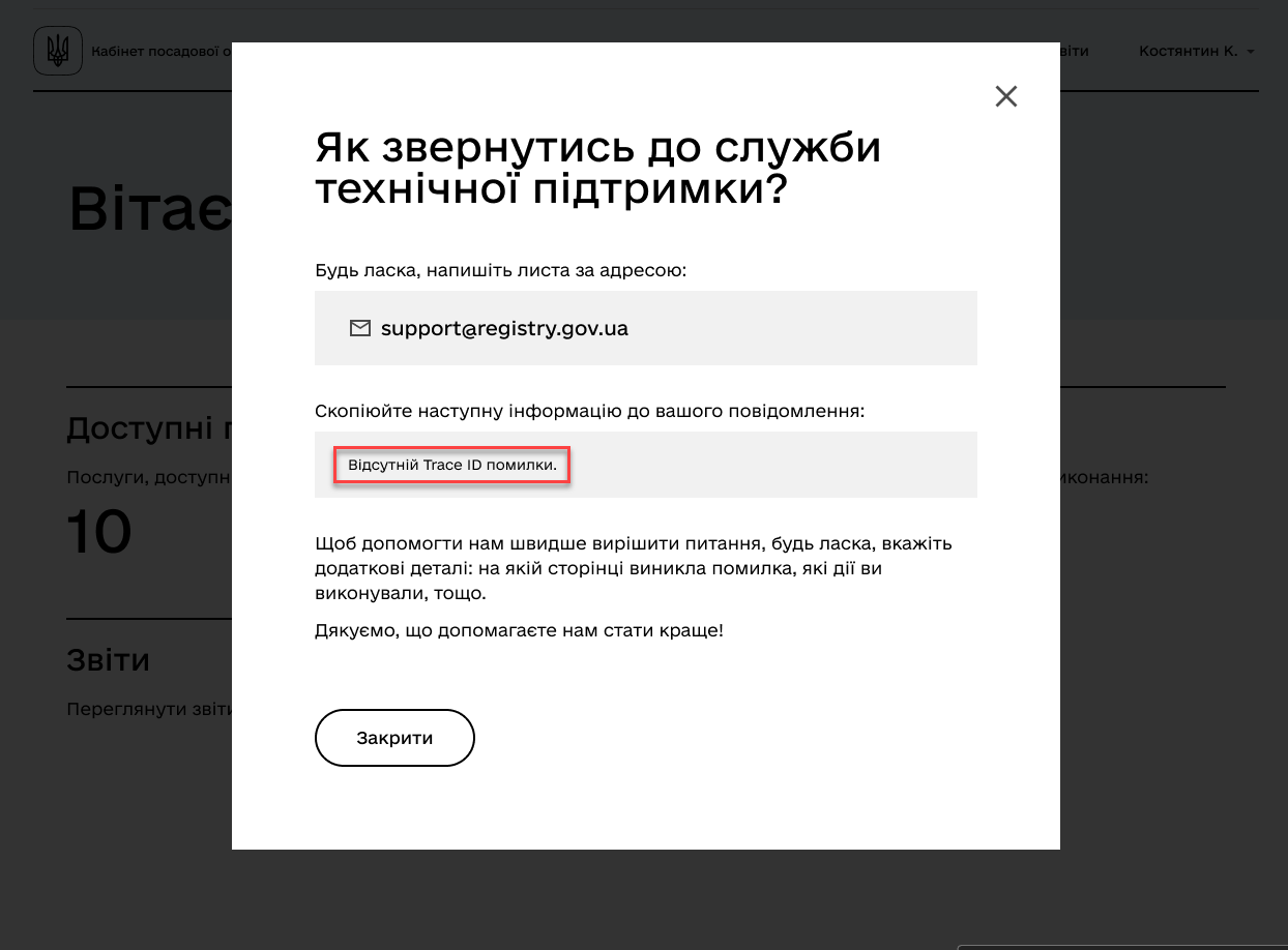 Напишіть листа за наданою електронною адресою support@registry.gov.ua. У текст повідомлення обов’язково скопіюйте Trace ID, який також надається у спливному вікні. Він може мати наступний вигляд: