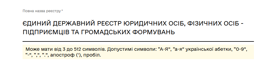 Повна назва — це офіційна юридична назва реєстру. Використовується в офіційному листуванні, у документах, колонтитулах кабінетів тощо.
