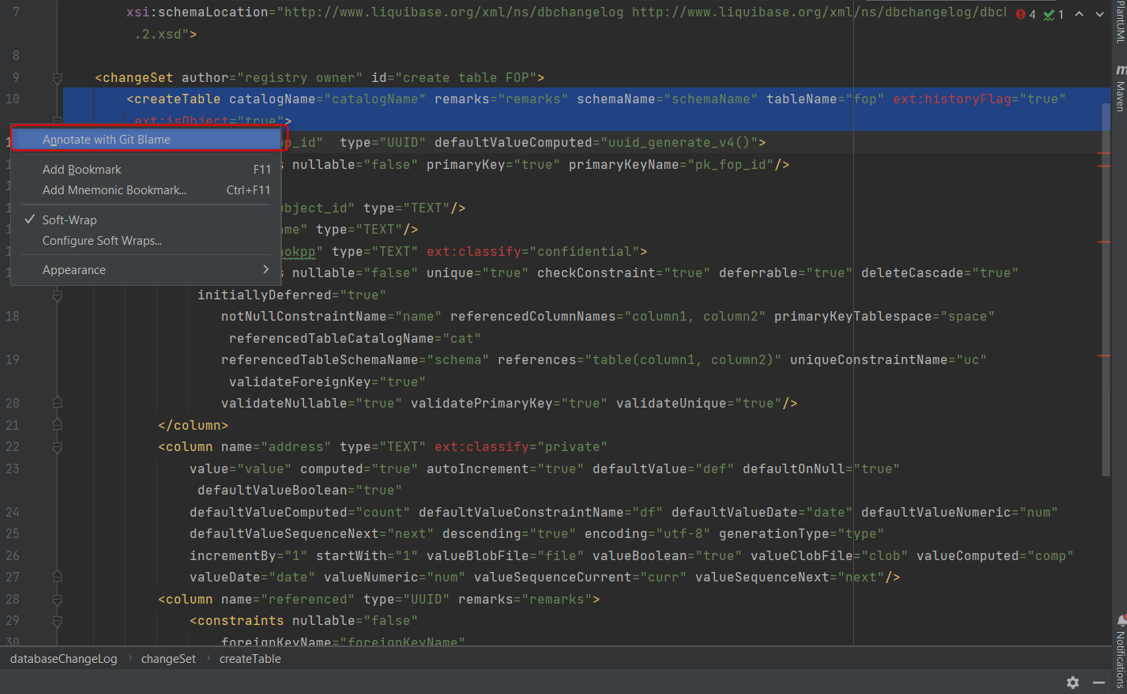 <changeSet>та їхнього вмісту. Крім того, він пропонує автодоповнення для типових і нетипових (розширених) тегів та атрибутів Liquibase, що сприяє правильній структурі XML-файлів та знижує ризик виникнення помилок.Детальніше про доступні теги для побудови моделі даних див. на сторінках Перелік стандартних тегів Liquibase та Розширення Liquibase для моделювання даних відповідно. -