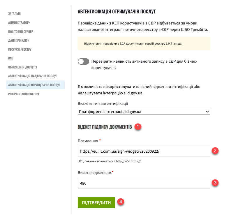 На вкладці Автентифікація отримувачів послуг перейдіть до Віджет підпису документів.