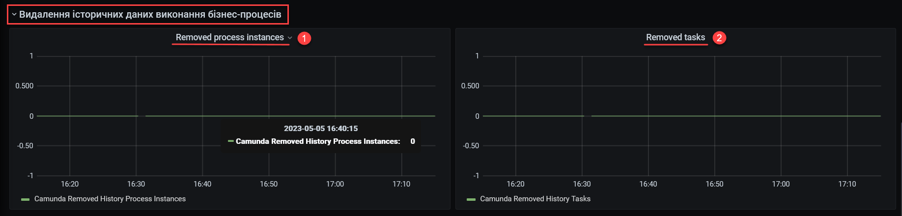 Removed process instances: показує кількість видалених історичних екземплярів процесів у рамках системи. Видалення історичних даних виконання бізнес-процесів допомагає забезпечити оптимальне використання ресурсів, покращуючи продуктивність та зменшуючи навантаження на систему.
