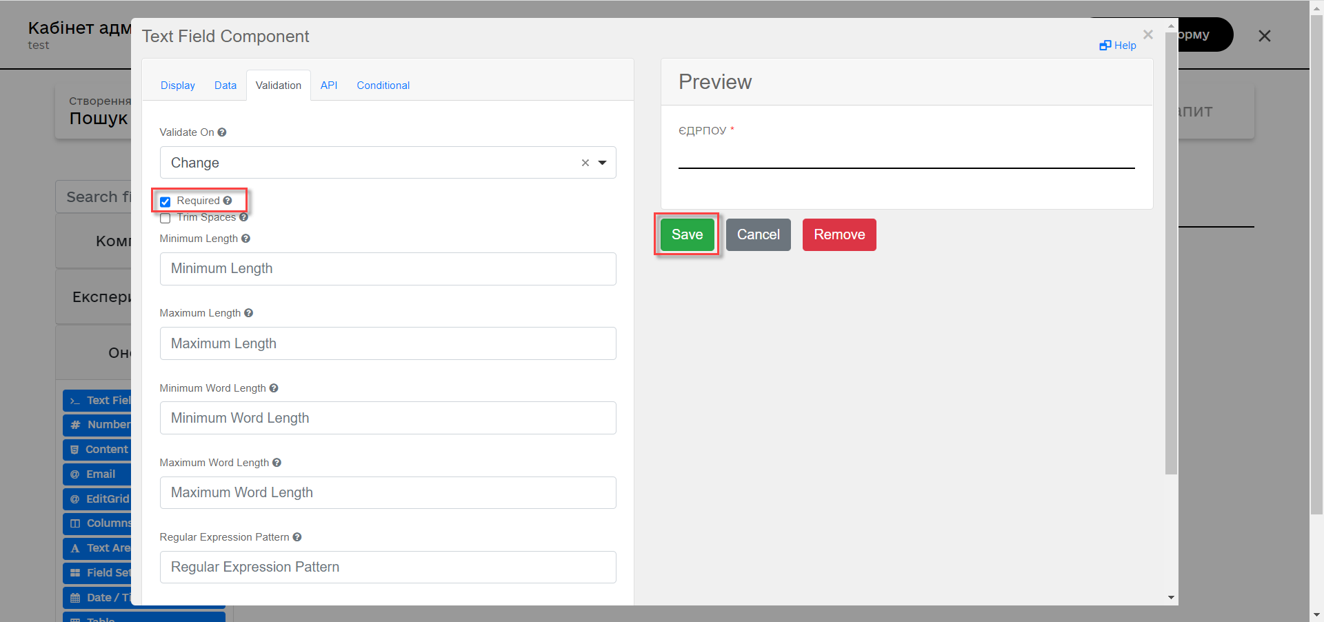 З панелі зліва перетягніть компоненти Textfield ПОЗА межами компонента Edit Grid та виконайте наступні налаштування: