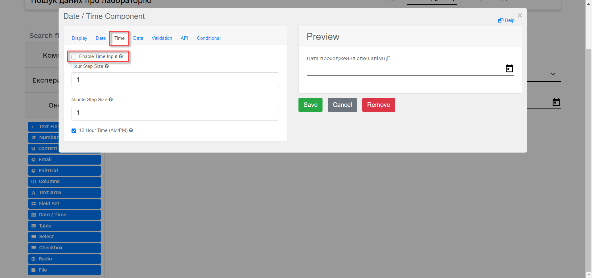 З панелі зліва перетягніть компонент Date/Time в поле компонента Edit Grid та виконайте наступні налаштування для отримання інформації з довідника: