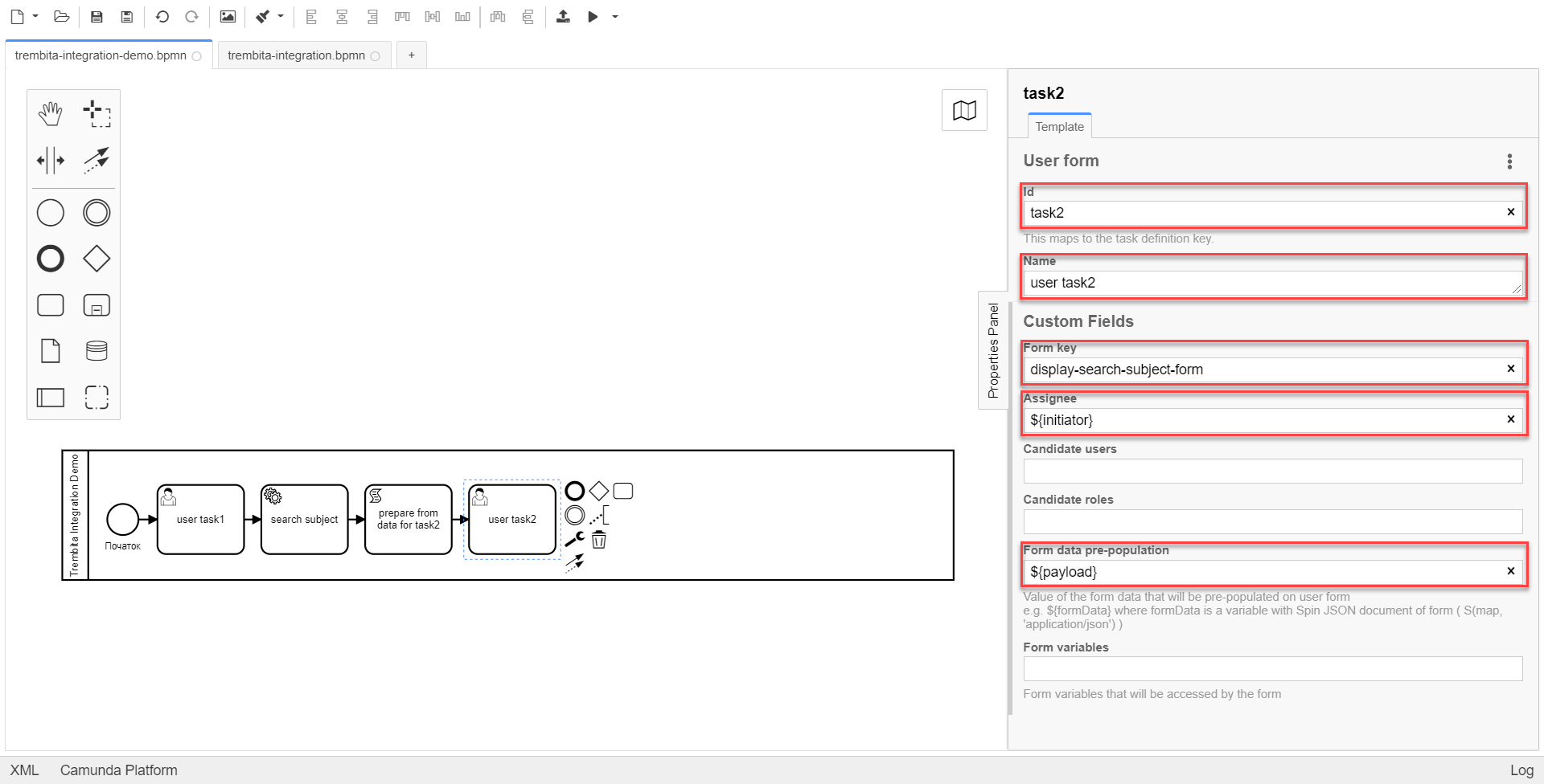 На етапі моделювання бізнес-процесу необхідно створити та зберегти відповідну BPMN-діаграму. Використовуйте файл trembita-integration.bpmn із готовою схемою бізнес-процесу як приклад. |