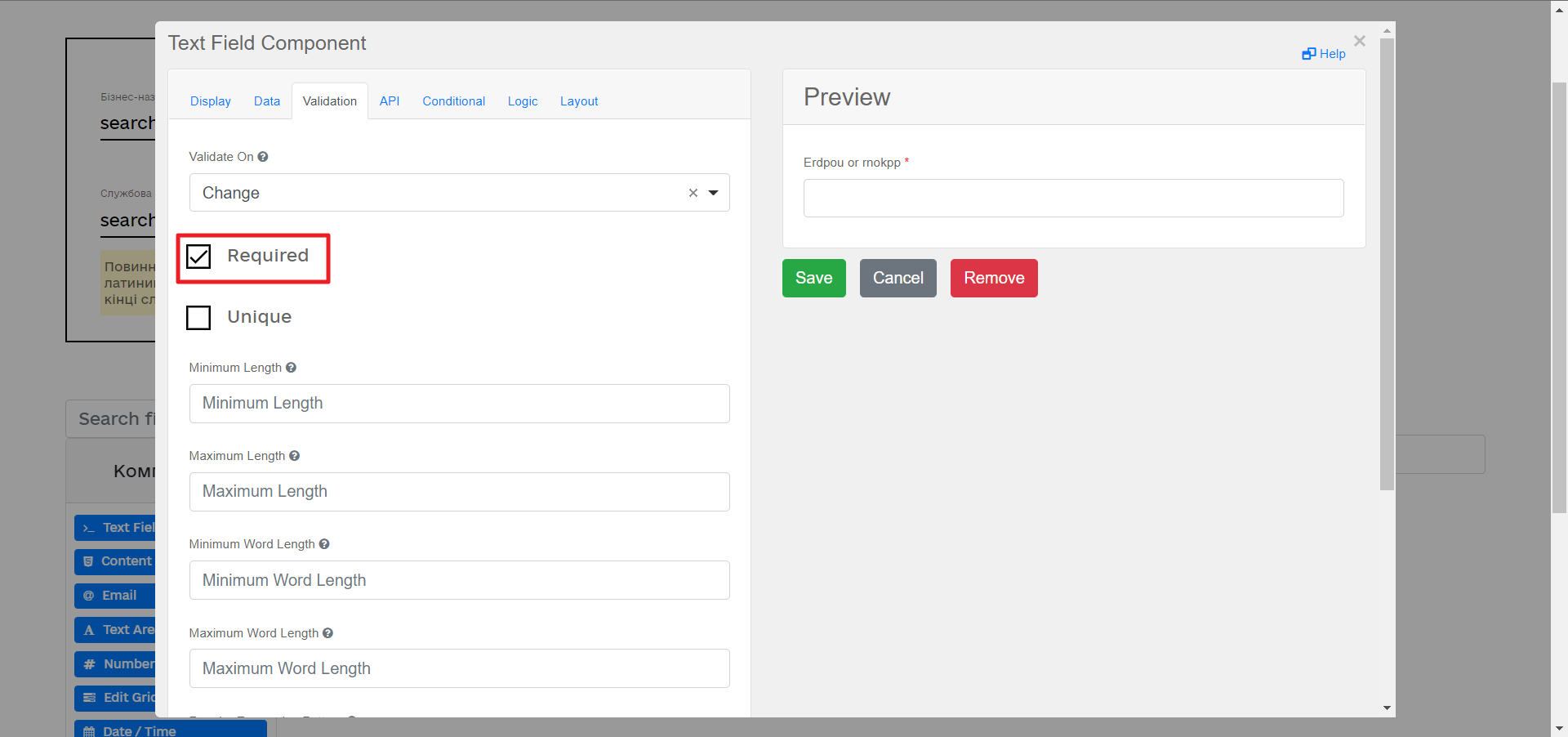 З панелі компонентів зліва перетягніть компонент Text Field до панелі моделювання та виконайте подальші налаштування.