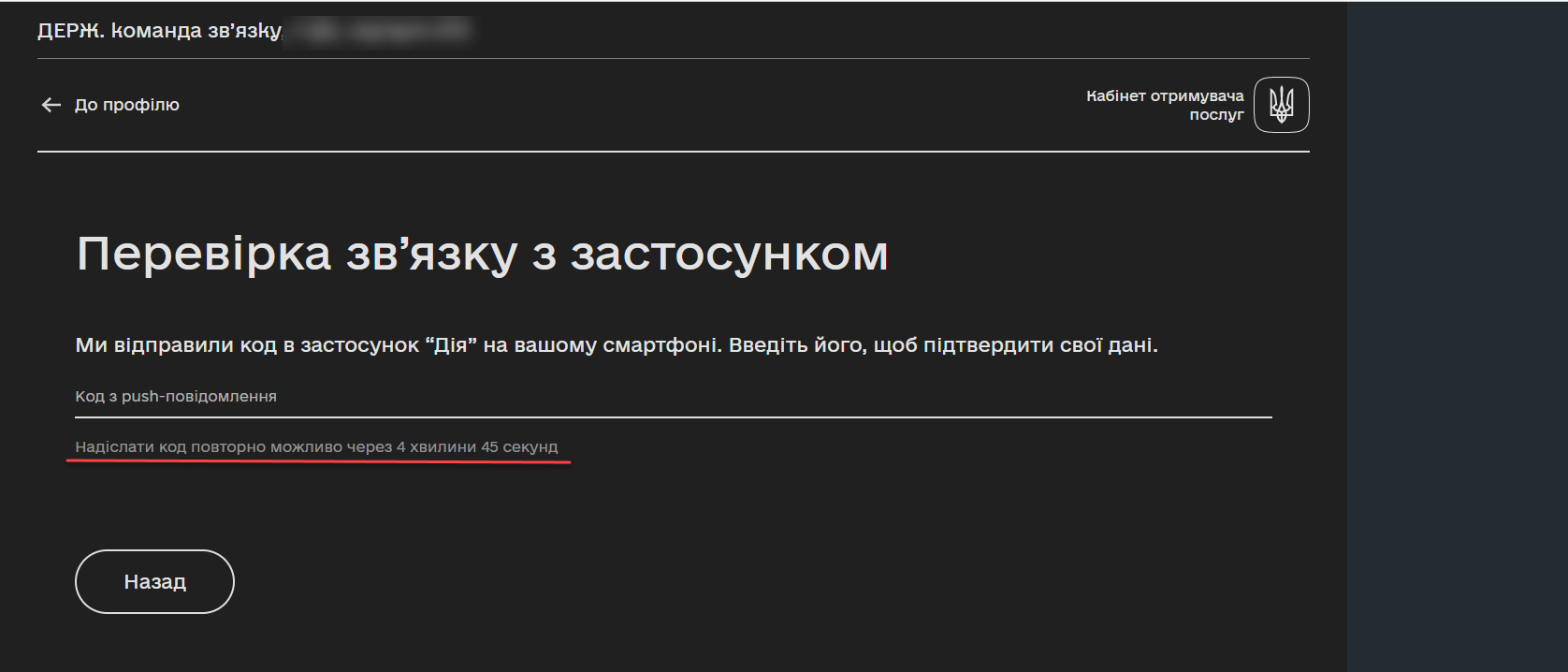 Код з push-повідомленнявведіть OTP-код, отриманий у мобільному застосунку "Дія" для підтвердження своїх даних.