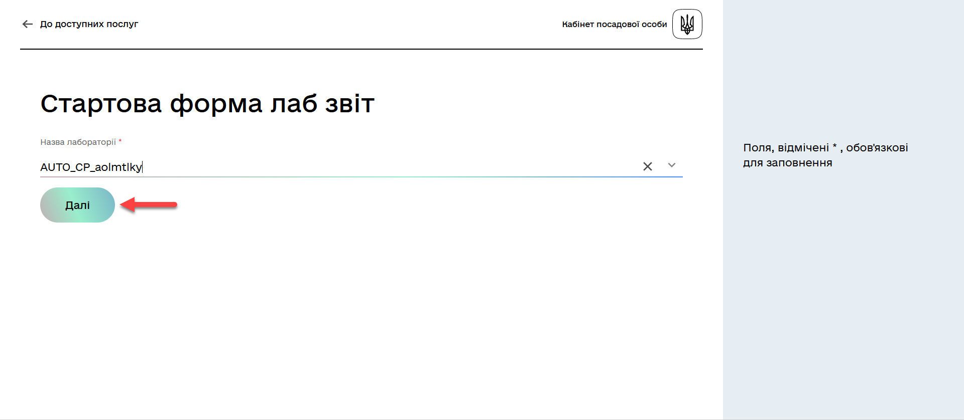 Введіть повну назву лабораторії, за якою необхідно сформувати витяг-звіт, або оберіть необхідну назву з випадного списку.