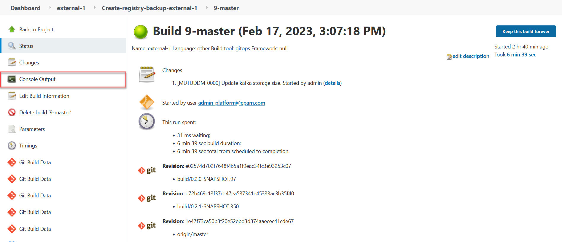Відкрийте Console Output, щоб переглянути технічний лог виконання пайплайну.