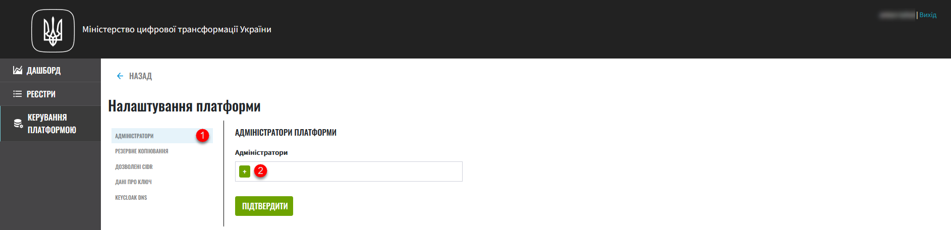 Відкрийте секцію Адміністратори та додайте нового адміністратора(-ів), яким необхідно надати доступ для керування Платформою.