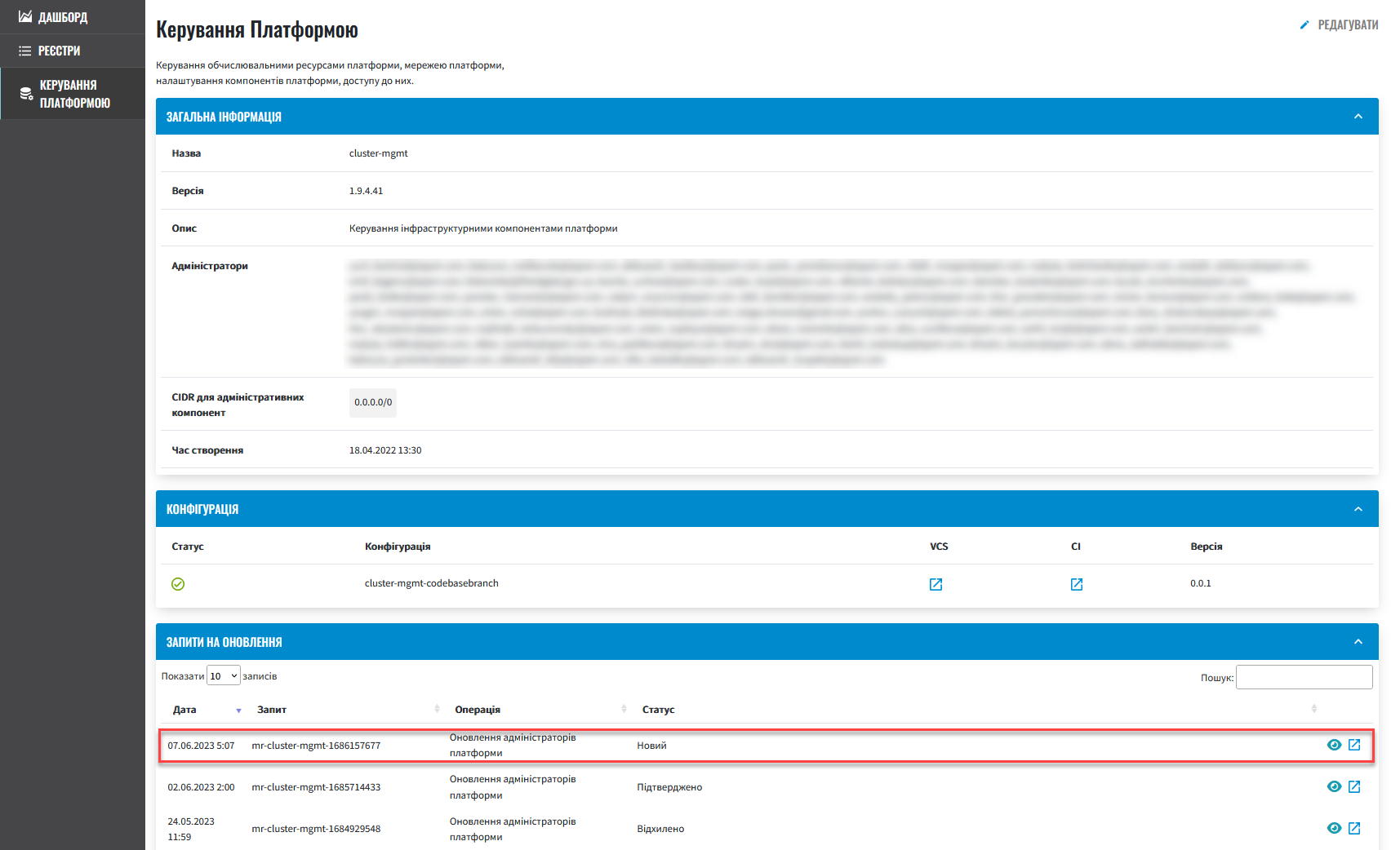 Підтвердити, щоб зберегти зміни.Ви можете також видалити адміністратора, натиснувши на відповідну іконку 🗑 навпроти імені користувача. В результаті у секції Керування Платформою > Запити на оновлення формується запит зі статусом