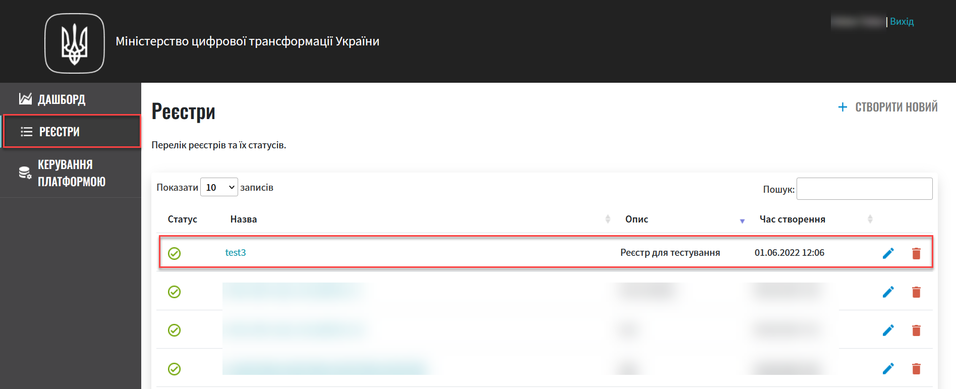 Якщо реєстру немає в переліку — його потрібно створити заздалегідь (див. детальніше — Розгортання екземпляра реєстру).