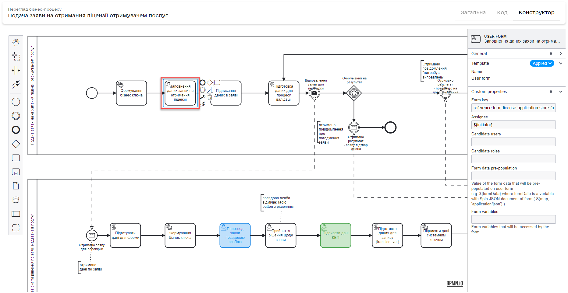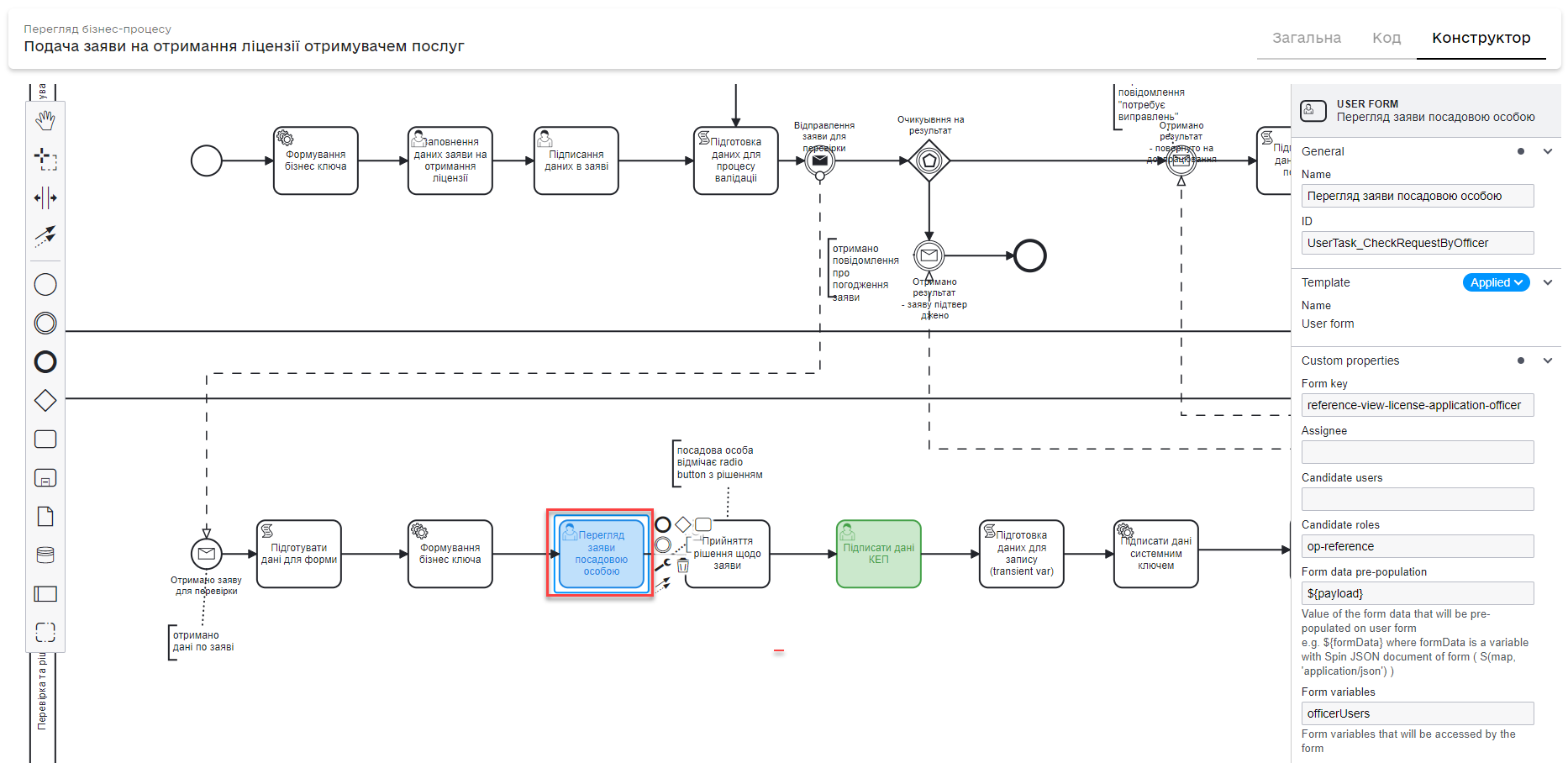 Де можна знайти приклад референтного бізнес-процесу?Адміністратор Платформи може розгорнути для вас демо-реєстр — еталонний реєстр, що містить референтні та інші приклади файлів для створення цифрового регламенту. Він містить різноманітні елементи для розробки моделі даних, бізнес-процесів, UI-форм, аналітичної звітності, витягів, сповіщень, зовнішніх інтеграцій та багато іншого. Еталонний регламент з прикладами для України зберігається в репозиторії Детальну інструкцію щодо розгортання демо-реєстру та отримання референтних прикладів моделювання ви знайдете на сторінці Розгортання демо-реєстру із референтними прикладами. Приклад BPMN-схеми процесу буде доступний у регламенті демо-реєстру за пошуком по ключовим словам — reference-license-application-with-back-for-update. Назви форм ви можете знайти всередині відповідних користувацьких задач (User Task) бізнес-процесу у полі