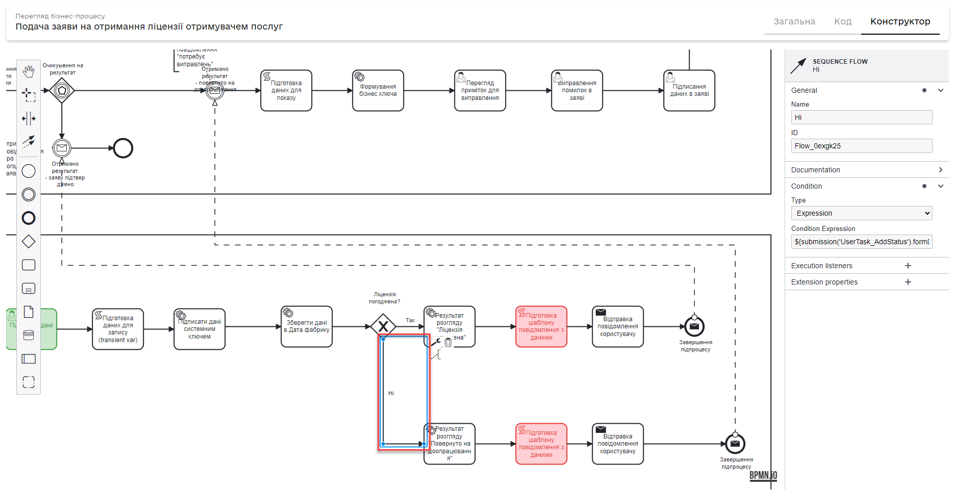 ${submission('UserTask_AddStatus').formData.prop("approveStatus").value().equals('approveLicense')}Це означає, що шлях процесу буде продовжено у напрямку, де ліцензія вважається погодженою.