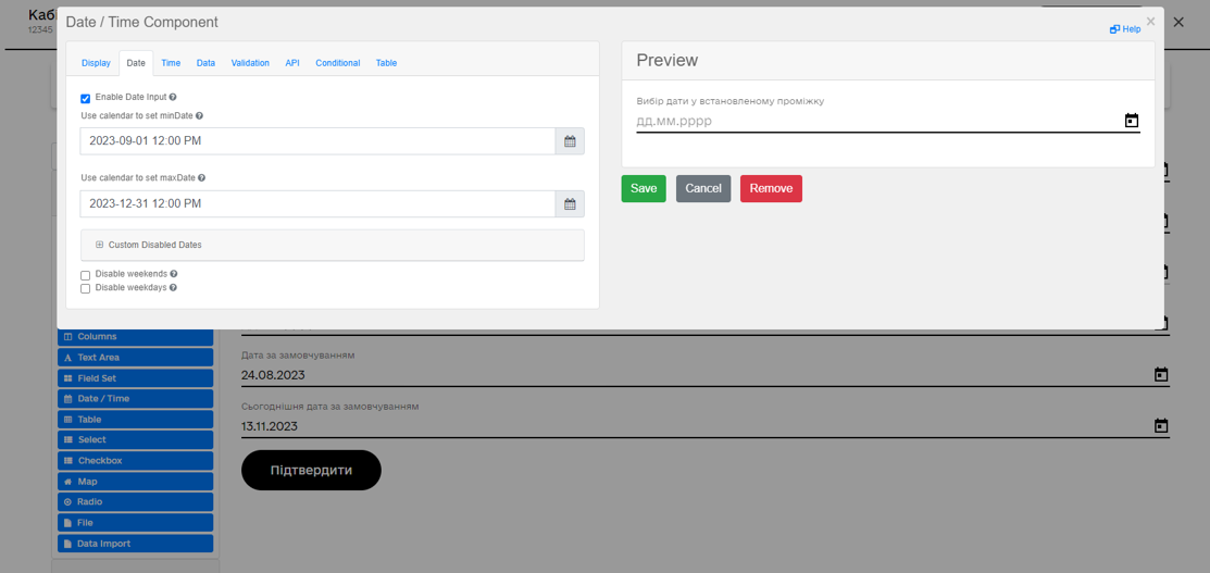 У Кабінеті адміністратора регламентів, створіть нову форму та оберіть компонент Date/Time.