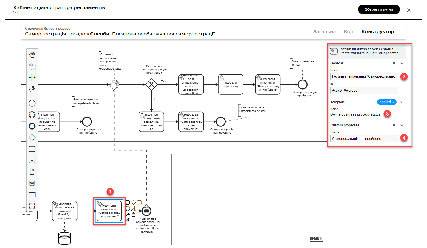 У полі вкажіть бажаний статус виконання бізнес-процесу, який побачить користувач. Наприклад, Реєстрацію пройдено.
