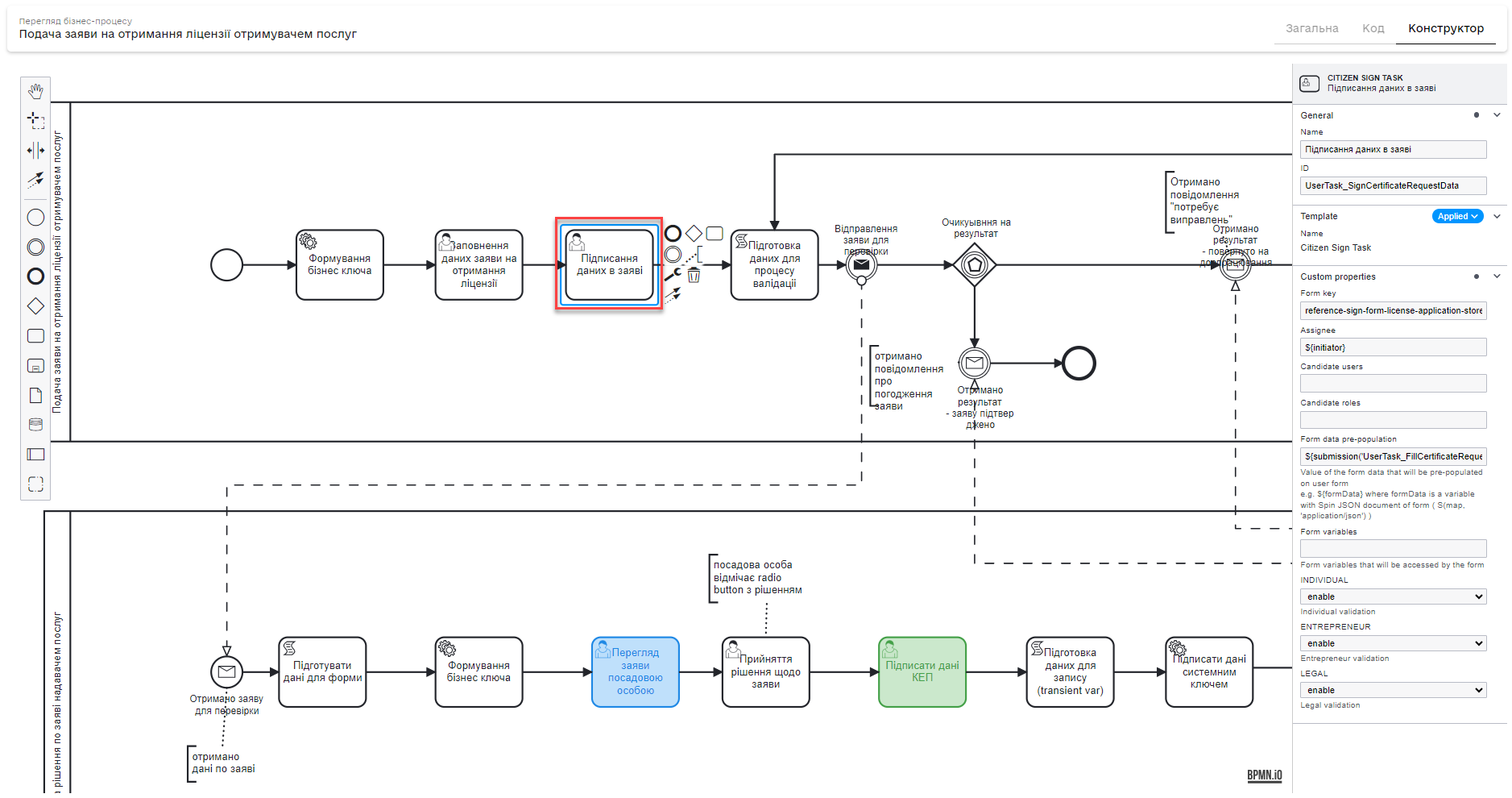Де можна знайти приклад бізнес-процесу?Адміністратор Платформи може розгорнути для вас демо-реєстр — еталонний реєстр, що містить референтні та інші приклади файлів для створення цифрового регламенту. Він містить різноманітні елементи для розробки моделі даних, бізнес-процесів, UI-форм, аналітичної звітності, витягів, сповіщень, зовнішніх інтеграцій та багато іншого. Еталонний регламент з прикладами для України зберігається в репозиторії Детальну інструкцію щодо розгортання демо-реєстру та отримання референтних прикладів моделювання ви знайдете на сторінці Розгортання демо-реєстру із референтними прикладами. Citizen Sign Task — делегат, який використовується майже в усіх бізнес-процесах, адже потребує виконання дій зі сторони людини в рамках завдань користувача. Тому приклади використання можна знайти в усіх бізнес-процесах у вашому демо-регламенті, які залучають отримувачів послуг. Ви можете використати один із багатьох прикладів процесів за пошуком по ключовим словам — reference-license-application-with-back-for-update. У Кабінеті користувача бізнес-процес буде доступний у розділі Доступні послуги. |