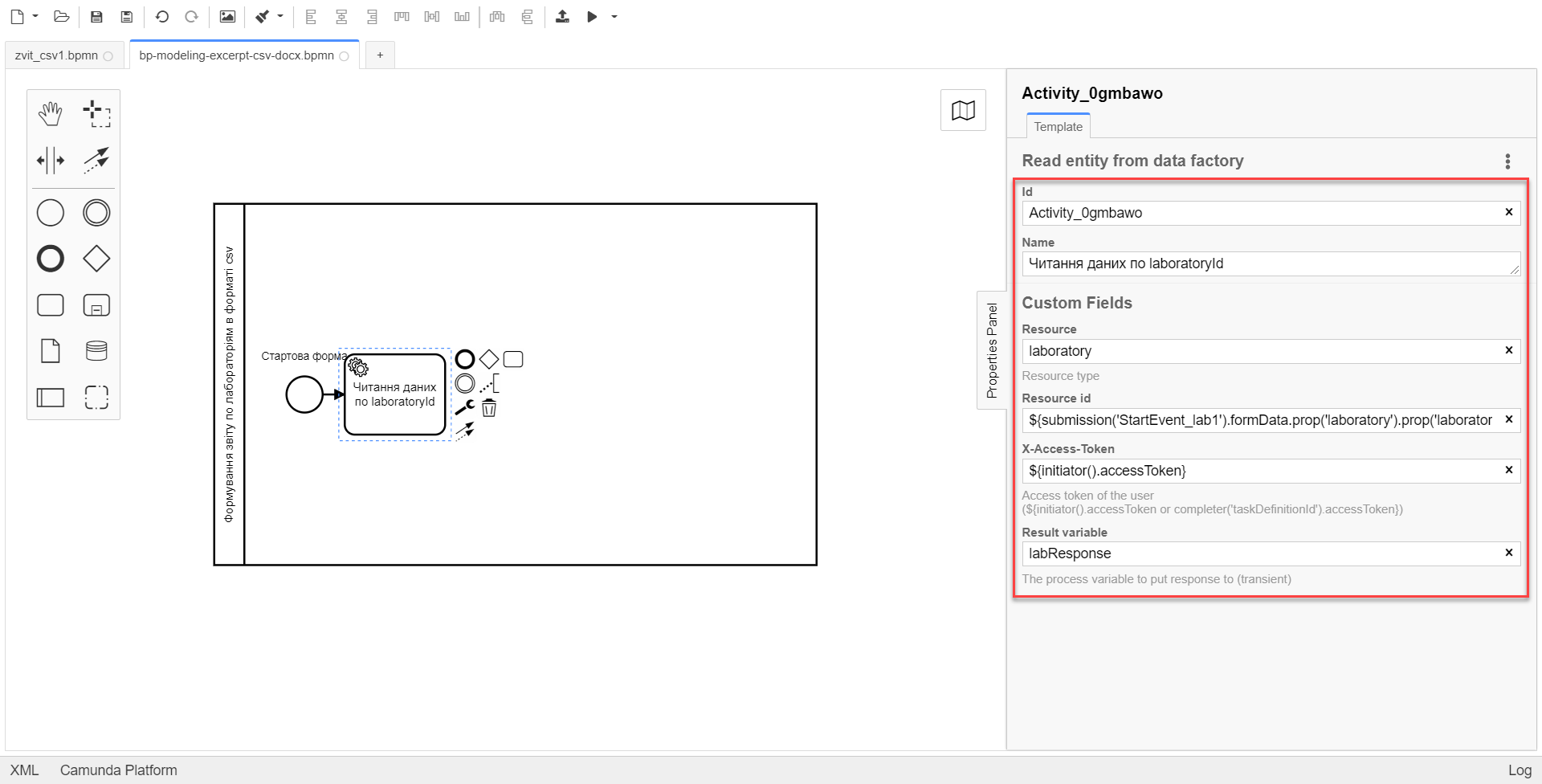 Resource idвведіть ідентифікатор ресурсу${submission('StartEvent_lab1').formData.prop('laboratory').prop('laboratoryId').value()};В нашому випадку ми передаємо ідентифікатор ресурсу