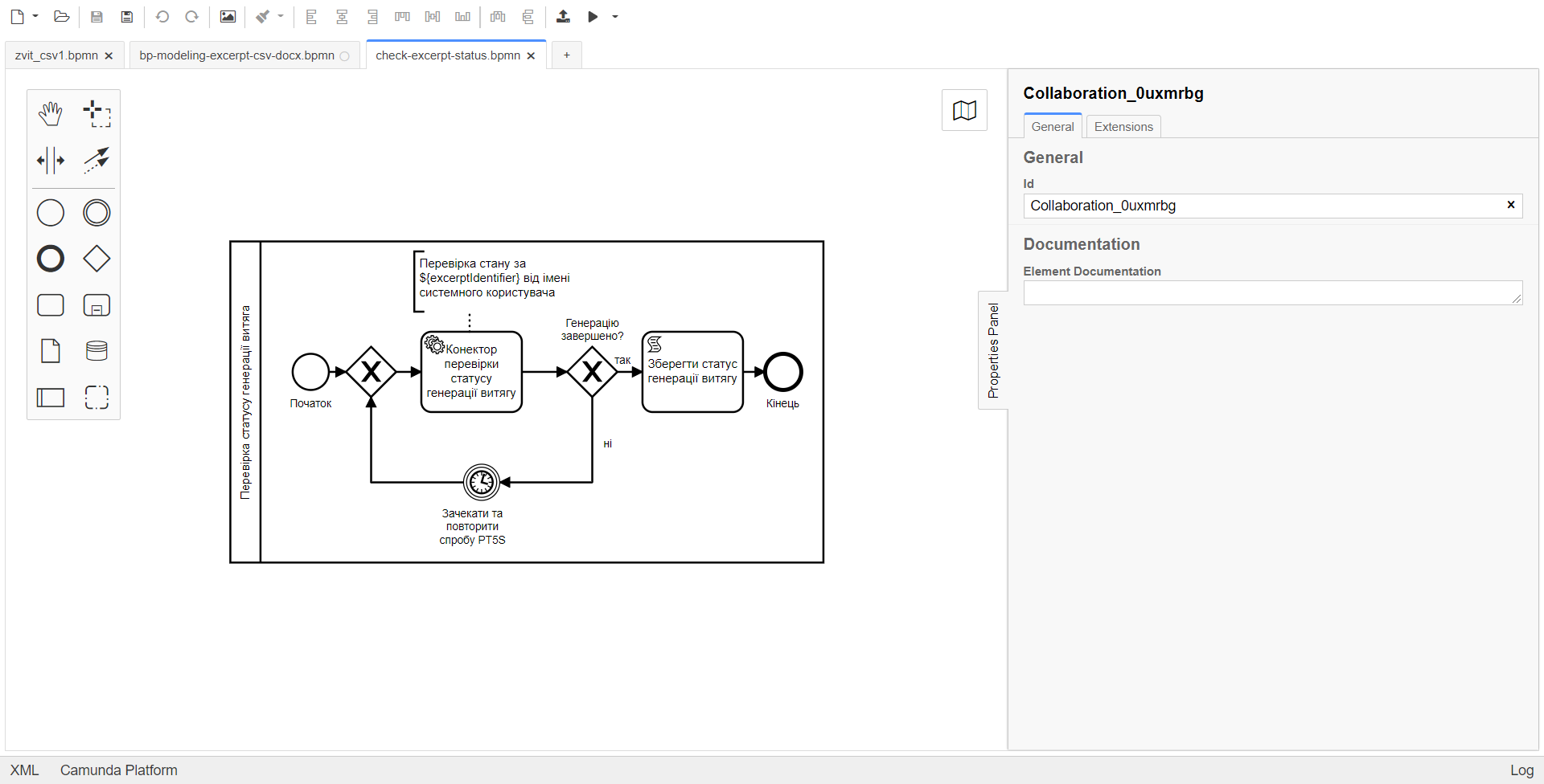 Приклад BPMN-схеми процесу буде доступний у регламенті демо-реєстру за пошуком по ключовим словам — check-excerpt-status.