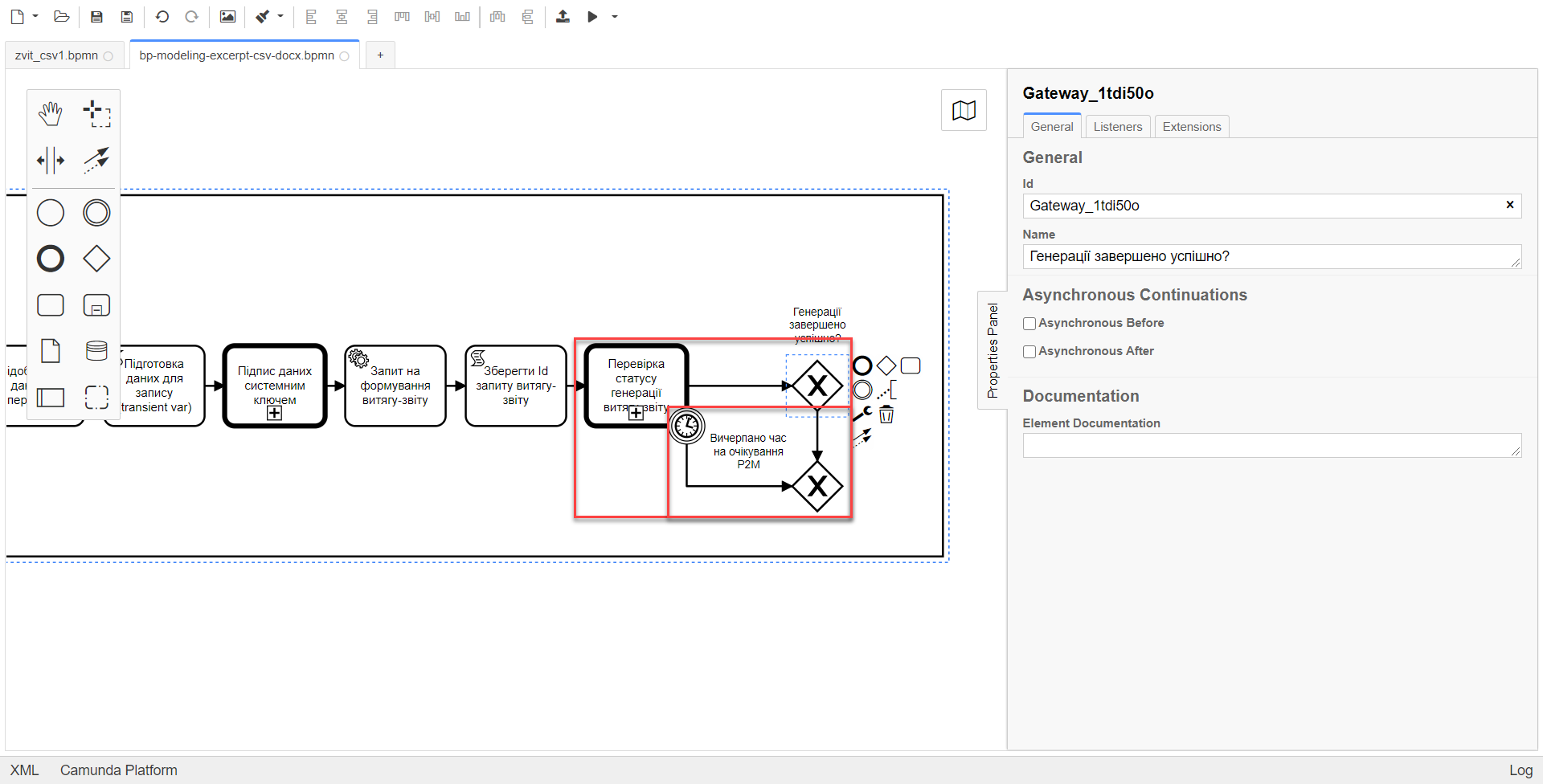 Додайте XOR-шлюзи для Call Activity "Перевірка статусу генерації витягу-звіту" і Timer Boundary Event "Вичерпано час на очікування P2M".