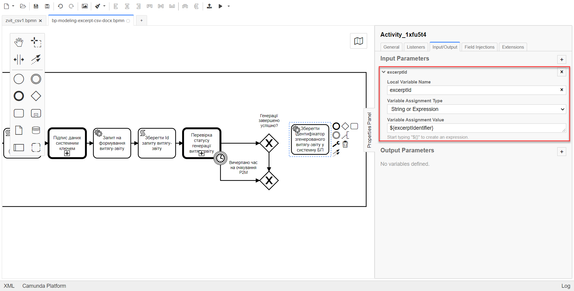 Output variable nameвкажіть назву змінної —excerptStatus, до якої необхідно зберегти статус витягу, отриманий в результаті виконання підпроцесу, що викликається.