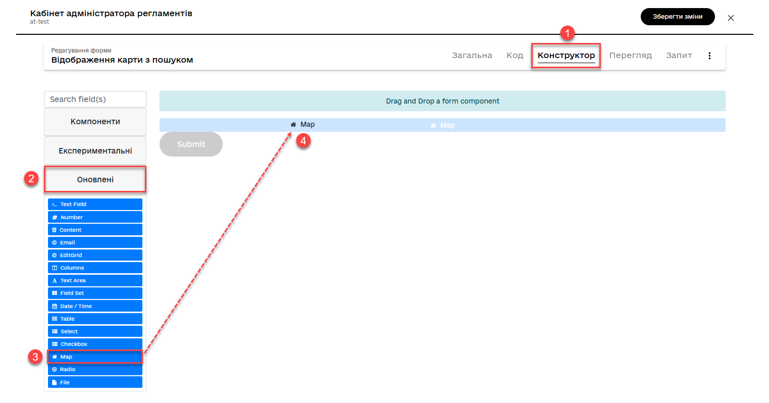 Налаштувати компонент Map можна у Кабінеті адміністратора регламентів, у розділі UI-форми.