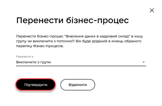 Ви можете перенести бізнес-процес в іншу групу чи виключити з поточної. Він буде доданий у кінець обраного переліку бізнес-процесів.