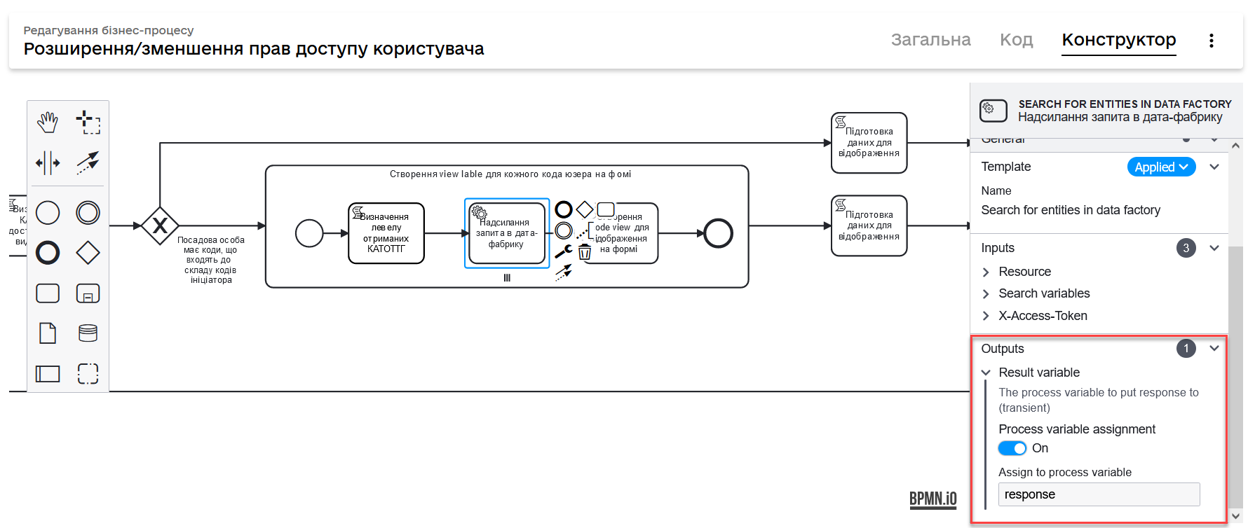 Далі необхідно виконати пошук даних КАТОТТГ за певними критеріями (параметрами code та level) у фабриці даних. Для цього використовується інтеграційний конектор до БД — Search for entities in data factory. При налаштуванні необхідно передати змінні code та level як ключі для пошуку та їх значення як змінні, отримані у попередніх задач бізнес-процесу.