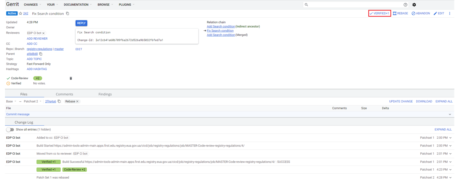 Після успішного виконання збірок у Gerrit на вкладці з’явиться наступне: