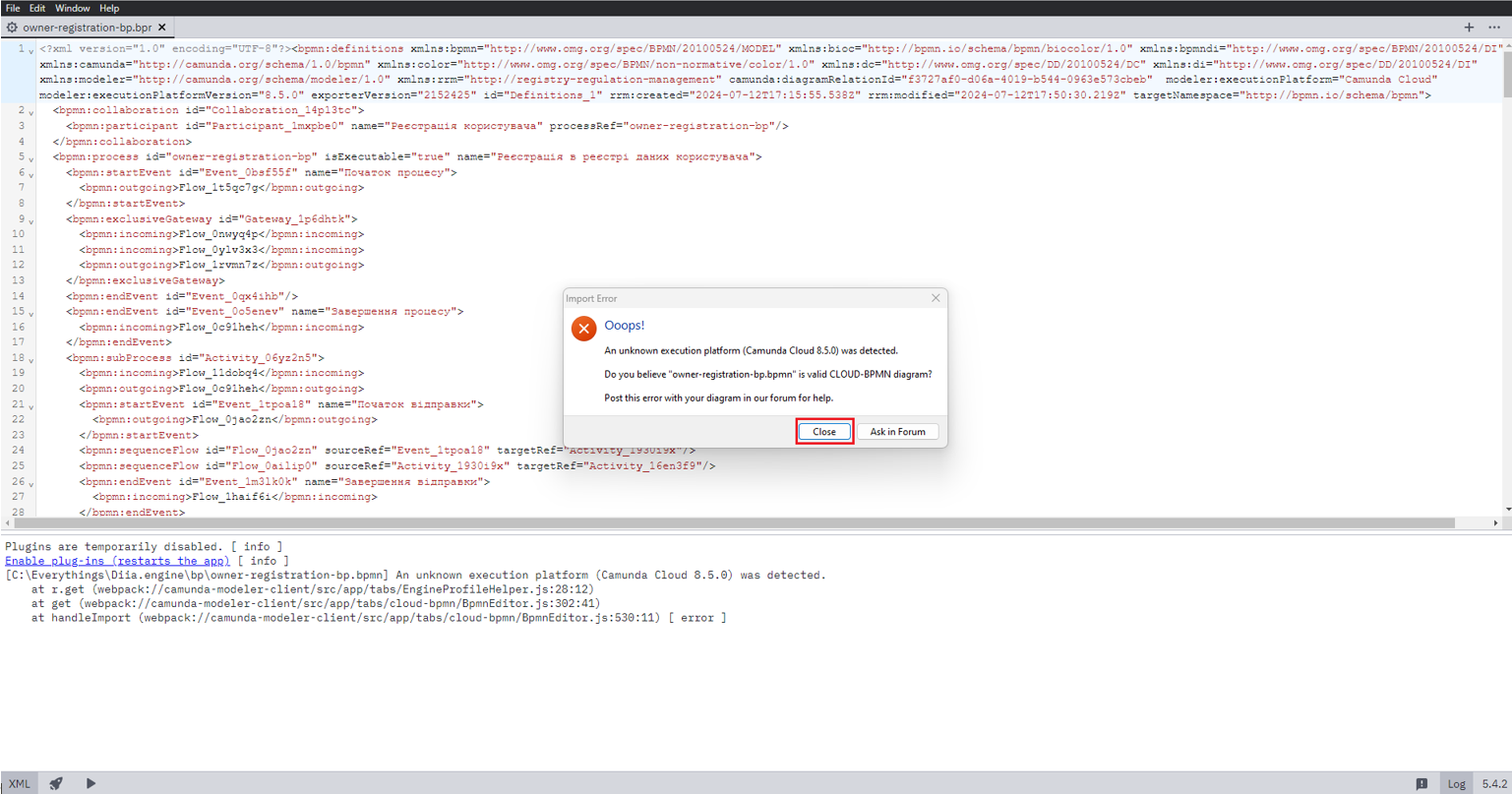 | Якщо виникає помилка через відсутність посилань на будь-які ресурси, додайте їх до шапки файлу бізнес-процесу. Докладніше про зовнішні ресурси можна переглянути на сайті розробника: https://docs.camunda.io. |